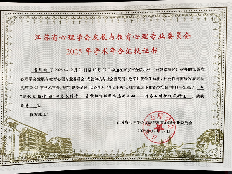 盟員曹照鵬應(yīng)邀參會并作專題發(fā)言,在兩大核心論壇中連獲特等獎、一等獎,展現(xiàn)出他在心理健康教育領(lǐng)域的扎實功底與責(zé)任擔(dān)當(dāng)。